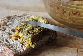 Si cette recette m'a attiré, c'est que contrairement à la plupart des pâtés végétaux qui se composent essentiellement soit d'oléagineux, soit de dérivés du soja, celle-ci fait la part belle aux légumes. Adaptée ici avec les légumes de saison que j'avais sous la main, je n'ai pas été déçue : un bon goût de panais mais qui reste suffisamment peu marqué pour laisser pointer celui du potimarron, et une texture bien crémeuse, qui se tient quand même. Je ne l'ai pas fait ici, mais pour ceux qui aiment un peu plus de texture, il est possible d'ajouter quelques noisettes ou noix grossièrement hachées, ou encore pourquoi pas, quelques morceaux de châtaignes!!