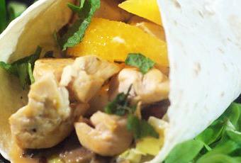 Monter les Wraps, déposer 1 vache qui riz et demi et étaler dans le Wrap, ajouter le concentré de tomate, puis des poireaux, des champignons et du poulet. Déposer joliment les suprêmes d’orange, saler et poivrer puis fermer le Wrap et piquer avec une petite pique.