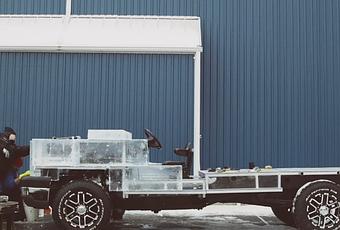 La marque Canadian Tire, spécialisée dans les pièces automobiles, a construit un 4×4 avec de la glace pour prouver que sa batterie « MotoMaster Eliminator » permet de démarrer une voiture avec une température allant jusqu’à -40°C. Pour la construction du châssis, 6,5 tonnes de glace ont été nécessaires à la construction de ce 4×4 Chevrolet Silverado 2500.