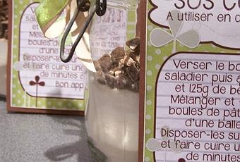 Tout y est : farine, sucre, sucre vanillé, chocolat, .... un bocal, un joli ruban et le tour est joué !