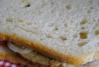 3) Garnir une tranche de pain avec des oignons, du steak de tofu et des tranches de tomates. Recouvrir avec la deuxième tranche de pain