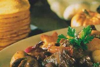 - Retirez les morceaux de viande de la cocotte, réservez-les au chaud. Filtrez le jus de cuisson et remettez-le dans la cocotte, laissez un peu réduire jusqu’à bonne consistance, puis ajoutez les morceaux de viande et les champignons. Mélangez 10 minutes sur feu doux.