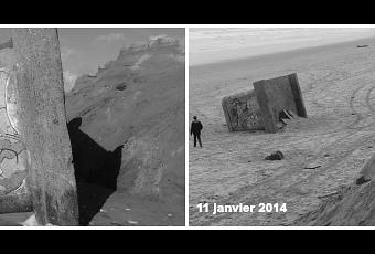Il se trouve que deux semaines plus tôt, j’y avais constaté le basculement sur la plage d’un blockhaus, mais celui-ci était alors au ras de la dune. Désormais, le blockhaus et la dune sont distant d’une bonne dizaine de mètres. Ce n’est pas le blockhaus qui a bougé mais bien la dune qui a reculé.