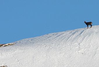 Très peu de neige par rapport à ma visite de l'an dernier en ces mêmes lieux. Grand calme et solitude pour le début de la promenade, jusqu'aux pistes de ski de fond, désertées. L'an dernier, montée directe vers le Pic. Cette fois-ci, je choisis de passer par le Col de l'Arc. C'était une bonne idée. Quelques traces dans la neige, je coupe et recoupe le GR par moments, jusqu'à que la pente en forêt devienne un peu plus forte vers Font Froide. Là, on quitte le GR puis la forêt, et la pente ajoutée à la neige glacée rendent utiles les raquettes - je les chausse pour surmonter le sursaut (républicain) rocheux. Là, vue sur le Col de l'Arc, le décor hivernal est superbe et des chamois gambadent et n'en font qu'à leur tête. C'est ça de partir "tôt". Je les reverrai plus tard, mais cachés dans la forêt.