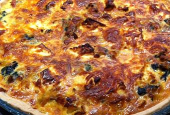 Installez votre pâte brisée dans le fond du plat à tarte et ajoutez y le mélange poireaux lardons épinard, versez dessus l'appareil à quiche et mettez les morceaux de fêta sur le dessus de la quiche et parsemez de mozzarella râpé et mettez au four pour 45minutes à 180°.