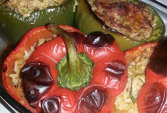 Une fois votre riz cuit, le mélanger à votre viande cru et fourrez les poivrons préalablement badigeonnés d'huile d'olive avec un pinceau.