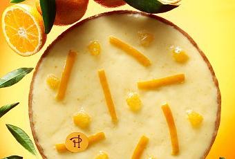 Pierre Hermé présente une tarte à la mandarine. Sur une pâte sablée, on retrouve une crème à la mandarine de Sicile, zestes de mandarine confits, et morceaux de chair de mandarine.