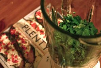 Après avoir haché toutes les herbes (c’est la partie la plus longue de cette recette), placez les dans un robot culinaire avec l’huile d’olive et réduisez les en une pâte verte. Hachez les pistaches, la roquette et les oignons verts et coupez très finement le piment (si vous n’aimez pas la cuisine un peu relevée, je vous déconseille de le mettre dans votre couscous!).