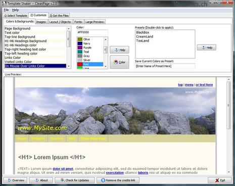 Ce produit est conçu pour donner à un concepteur de sites Web, une solution rapide et facile de modifier l'apparence, la mise en page d'un template prédéfini. Vous pouvez modifier les images, les arrière-plans, la couleur du texte, le fond de page, etc. Cette première version est livré avec 3 modèles prédéfinis mais vous pouvez produire des centaines de modèles en jouant simplement avec les différents paramètres de personnalisation. Les modèles génèrés par cet outil sont libres de droit à condition que vous laissiez le copyright en bas de page. Toutefois, au cas où vous désireriez les supprimer, il existe une version commerciale pour le prix de 29$.