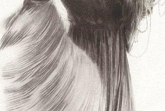 "Son chapeau placé dans le filet sous un grand mouchoir de soie, a été remplacé sur sa tête par un voile de dentelle noire, noué sous la nuque, et appelé à préserver ses cheveux de la poussière.