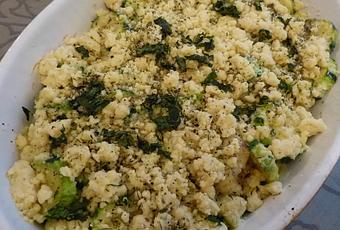 Beurrer un plat allant au four et y déposer les courgettes. Ajouter le mélange à crumble, ainsi que quelques feuilles de basilic coupées finement et une grossse pincée de feuilles de thym séché.