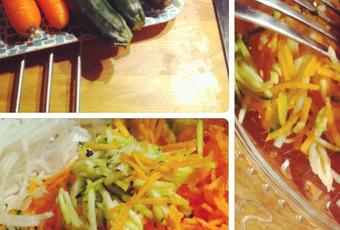 Passer le tout au robot mixeur avec une grille qui râpe, verser le résultat obtenu dans un saladier, assaisonner avec un peu d’huile d’olive et de citron, et Bon Ap’ ! J’ai enlevé la peau des carottes et du radis noir, mais pas des courgettes. C’est tout a fait mangeable, et ça donne une belle couleur à la salade. Les légumes sont crus et regorgent de vitamines, parfait le soir à la place de la soupe !