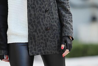 After the leopard in a fluffy version, today I present you a military way to wear leopard ! I’ve already told you I was fond of Diesel denim, but I also have a crush for Diesel coats (lovely details and volumes). Concerning the other clothes I am wearing, you’ve already seen my white sweater and my high black boots. This fake leather tregging joined my big collection of shiny legging or pants. A final touch of color with coral polish. Have a nice week, I’m off to to Paris for a TV set !