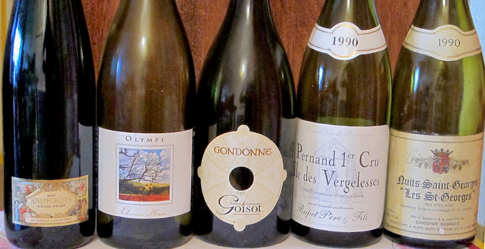 Avec une pintade rôtie, pleurotes et purée de vitelottes, deux vins ont été également servis. Pernand-Vergelesses, Premier cru Ile des Vergelesses 1990, domaine Rapet père et fils (ouvert et épaulé trois heures avant le service) : une robe éminemment jeune. Un nez sur des notes d'évolution mesurée (humus, cuir, feuilles de rose) ne cachant pas un fruit intense (fruits rouges / cerises / fraises) et des notes plus sudistes (olives). Une première impression terrienne, tellurique et terroiriste. En bouche, c'est étonnamment jeune, ample et tendu par l'acidité encore bien présente, avec une sorte de grain qui donne du relief au vin, une sorte de toucher de bouche soyeux). Belle finale sur la réserve d'acidité, qui prolonge le plaisir de ce breuvage encore en pleine jeunesse. Excellent Nuits Saint Georges, Premier cru les Saint Georges 1990, domaine Chicotot (ouvert et épaulé trois heures avant le service) : Encore une marche supplémentaire avec ce vin. Dès le premier nez, on ressent la profondeur d'un grand cru, c'est immédiatement suave et sensuel, profond, large, long et prégnant. Nez très nuiton, sur les fruits macérés, le cassis, la réglisse et les cerises noires. Notes complémentaires tertiaires, évoquant le cuir fin. En bouche, c'est proprement magnifique de précision et de définition. Tannins fondus, caractère polissé, de la mâche, du velours et une acidité encore bien présente qui me fait penser que quelques années de garde sont encore possible (las, il ne m'en reste qu'une bouteille). Un véritable grand cru, entre profondeur, intensité, soyeux et suavité. LE GRAND VIN