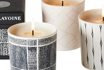 Chaque bougie est présentée dans un verre aux motifs graphiques. Cette édition 2014 livre propose des parfums d’ambre et des notes orientales.