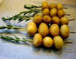 Faire cuire les pommes de terre 25 minutes dans l'eau bouillante salée, les laisser refroidir .Sur chaque branche de romarin enlever de la tige principale les pousses des cotés pour ne garder que 7/8 feuilles au sommet de la tige . Découper en pointe la tige pour qu'elle ressemble à une brochette .Enfiler 3 pommes de terre par tiges en les avançant bien vers le sommet. Couper le morceau de tige dépassant .