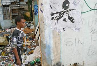Shoot The Bank photographié par Eric Maréchal (Street Art Without Border) après son collage à 'Crackolandia', Sao Paulo, Brésil. Quartier de sans abris et de crackers. Art Fabric est le nouveau projet d'Eric Maréchal. vous pouvez visiter son nouveau site ici: http://www.theartfabric.com
