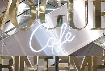 Le Vogue Café est un lieu éphémère situé au coeur du Printemps Haussmann. Le Vogue Café est ouvert depuis le 23 janvier et jusqu’au 22 mars prochain. Le décor a des airs d’appartement privé, confortable et chaleureux, mêlant modernisme des années 50 et design scandinave, sculptures du mid century modern et couvertures du magazine, opulent lustre doré Delightfull et mannequins soigneusement habillés par les stylistes de la rédaction.