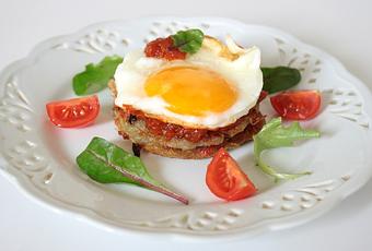 - Disposer une galette sur chaque assiette, puis mettre 1/4 de la salsa au curry, une autre galette, 1/4 de salsa puis l'oeuf au plat.