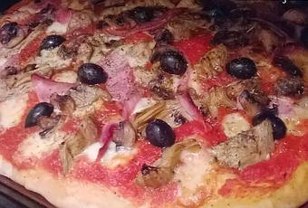 Pour une grande pizza, il vous faut... - 400 gr de farine. - 15 gr de levure fraîche. - 1 pincée de sucre. - 250 ml d'eau tiède. - 1 cuillère à soupe d'huile d'olive. - 1/2 cuillère à soupe de sel. - 200 gr de tomates pelées en conserve. - 2 gousses d'ail. - Une dizaine de petits champignons de Paris. - Un bocal d'artichauts à l'huile. - Une boule de mozzarella. - 100 gr d'olives noires dénoyautées. - 80 gr de jambon blanc. - Huile d'olive. - Sel. - Origan. On commence par la préparation de la pâte. - Dans un bol, émietter la levure fraîche et mélanger avec le sucre et l'huile d'olive. Laisser reposer 10 à 15 minutes jusqu'à ce que le mélange soit mousseux. - Dans le bol du robot, verser la farine et le sel, mélanger avec le batteur plat (vitesse 2). - Remplacer le batteur plat par le crochet à pâte, et ajouter progressivement le mélange à base de levure (toujours vitesse 2). Pétrir jusqu'à ce que la pâte forme une boule, élastique et souple. - Couvrir d'un linge humide et laisser reposer 1 heure minimum : la pâte doit doubler de volume. - Quand la pâte est prête, la rompre en l'écrasant avec le poing, puis pétrir à nouveau brièvement (vitesse 2) : cette étape évite que la pâte ne se rétracte une fois abaissée. - Préchauffer le four à 250°C. On passe à la garniture. - Mixer les tomates pelées, saler la sauce obtenue et y ajouter une cuillère à soupe d'huile d'olive. Bien mélanger.