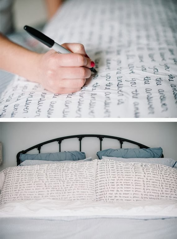 D'abord, nous abordons le tissu. Parce qu'il est possible d'utiliser le Sharpie sur tous les matériaux et surfaces. Je vous présente donc la version oreiller! Deux éléments : un tissu, de préférence en coton, et un sharpie à tissu (disponible dans tous les magasins ou directement sur internet!). Pourquoi ne pas intégrer vos poèmes ou vos chansons favorites à votre décoration?