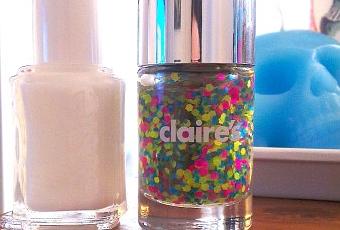 J'ai donc opté pour un vernis à base transparente, parsemé de nombreux confetis jaunes, bleus, verts et roses fluos, proposé par la marque Claire's. Voici le bébé :