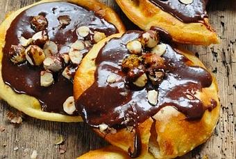 Et comme j'avais un peu de pâte à pain qui trainait à la maison et que je venais de découvrir cette recette gourmande, il n'en fallait pas plus pour que je me jette dans des pizzettes furieusement enchocolatées.Pizzettes furieusement enchocolatéesIngrédients : 400g de pâte à pain (vous pouvez aussi utiliser de la pâte à pizza) - 150g de chocolat noir – 150g de crème liquide entière - 60g de praliné en grain (ce sont des noisettes sucrées réduites en grain) – 60g de cassonade – 60g de noisettes entières – 2càs de sucre en poudre – 1 jaune d'œufCassez le chocolat dans un petit saladier. Portez la crème à ébullition puis versez-la sur le chocolat. Couvrez le saladier d'une assiette et laissez fondre le chocolat.Mélangez avec un fouet puis ajoutez le praliné que vous aurez réduit en poudre et la cassonade. Mélangez bien puis laissez refroidir.Etalez ensuite finement la pâte à pain, environ ½ cm, sur une table farinée. Avec un bol d'environ 12 cm taillez autant de cercles que possible. Roulez la pâte restante, étalez-la de nouveau, taillez de nouveaux cercles avec votre bol et recommencez jusqu'à ce qu'il ne reste plus de pâte. Posez les cercles de pâte sur une plaque couverte de papier sulfurisée au fur et à mesure.Piquez le centre des cercles à la fourchette pour que la pâte ne monte pas trop à la cuisson, si elle monte quand même ce n'est pas dramatique vous pourrez toujours l'écraser avec une spatule. Badigeonnez avec le jaune d'œuf le tour sur 1cm.