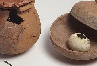 Les deux pots, bien qu'enterrés depuis environ 2000 ans, sont relativement intacts. L'un contient les restes d'une coquille d'oeuf en parfait état de conservation.