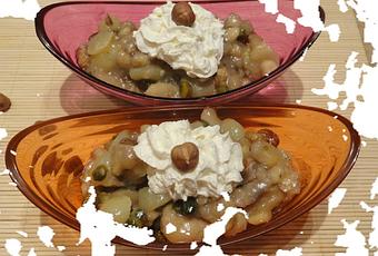 Répartir la salade dans de jolies coupelles, décoré d'un peu de chantilly et des noisettes.