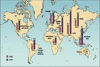 Nombre de cas de diabète dans le monde en 2000 (vermillon), et les projections pour 2030 (violet).