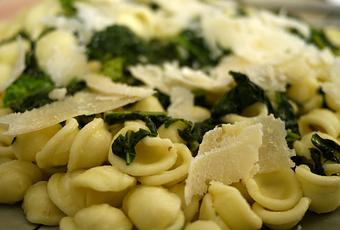 Rien que ce titre nous mène directement chez nos voisins transalpins jusqu’aux confins des Pouilles (talon de la botte). Dans cette recette de pâtes, on retrouve un ingrédient peu commun, les fameux « cime di rapa » (prononcé tchimé) qui sont les rejetons des navets. Cuits, ils développent une petite amertume plutôt agréable. Si vous n’en trouvez pas, vous pouvez facilement les remplacer par des pousses de brocolis, que j’appelle « brocolettes » (en général ça fait beaucoup rire).
