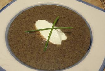 Verser bien chaude dans des assiettes creuses et ajouter une quenelle de crème fraiche.