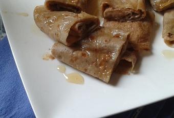 Dans cette première recette, on mélange de la farine de seigle et de la farine de blé et le lait est remplacé par une boisson au soja vanillé. Pas de beurre, mais un peu d’huile d’olive. Puis on réalise une garniture très légère au yaourt de soja et au pain d’épices. Avant de déguster, un filet de miel. Résultat : Les crêpes sont très parfumées et subtilement épicées. J’aime beaucoup cette recette, originale par ses ingrédients et par sa présentation en petits rouleaux. Elles sont parfaites pour un goûter gourmand accompagnées d’un thé.