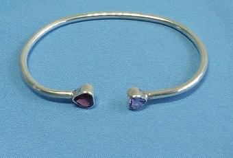 Un bracelet jonc compose cette parure, fait d'un fil rigide d'argent terminé par deux pierres en forme de coeur, un grenat et une améthyste serties clos.