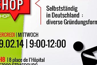START HOP lädt Sie zum 2. Workshop im Jahr 2014 ein Mittwoch 19. Februar 2014 von 9.00 bis 12.00 Uhr im PH8, Nr.8 rue de l'Hopital in StrasbourgThema : "Selbständing in Deutschland und dem Eurodistrikt".Frau Gery von der IHK Freiburg wird Sie informierenÜbersetzung wird gewährleistet. Eintritt frei.