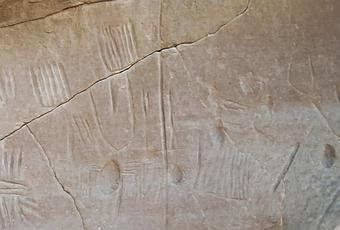 Un morceau de roche qui semble avoir été rompu du panneau principal représente des créatures dessinées dans un style différent, leurs membres ne sont pas flexibles, ils ont plutôt un aspect plat. Cela pourrait être une tentative pour dépeindre un moissonneur, un insecte qui ressemble à une araignée.