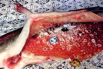 Une étonnante nappe en toile cirée TOILETPAPER bY Seletti qui propose une collection d'assiettes, de mugs et de nappes au look extravagant et surréaliste. L'image du poisson farci de pierres précieuses est une image culte qui vient du magazine Toiletpaper.