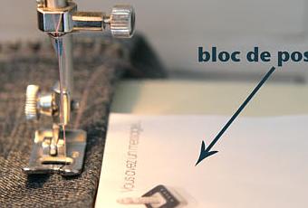 Plutôt que d’acheter des pieds presseurs spécial surpiqure ou bien un guide de couture aimantée (qui ne marche pas sur les machines électroniques de toutes façons), il suffit de placer et coller un bloc de post-it à droite de votre pied presseur, à la bonne distance. De cette façon, vous obtiendrez une surpiqure bien régulière sans rien dépenser !