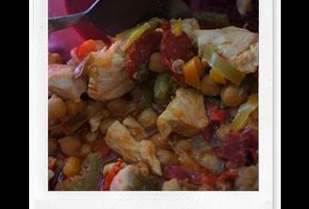 Ajoutez le chorizo coupés en rondelles , le poulet coupés en morceaux,les pois chiches , le curcuma, le bouillon de volaille émietté et l’eau.