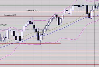 Dans ce cas, le graphe long terme indiquerait une rechute probable vers les 3650 points voire 3450 points qui correspondent aux retracements de 50% ou de 61,8% de l'ensemble de la hausse depuis juin 2012.