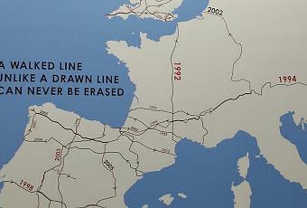 D'abords, j'ai pu découvrir l'exposition, installée dans un bâtiment qui fut autrefois entrepôt de poissons et dont les grands espaces ont très bien convenu à l'artiste. De grands wall paintings et quelques photographies textes étaient disposés. Ces traces de voyages à pied et d'expédition sont des évocations fortes des oeuvres elle mêmes, qui sont les marches. On sent l'homme des grands espaces et une forte maîtrise de la topographie dans cet aménagement de l'espace, où les mots et les images se répondent aussi d'une pièce à l'autre. C'est aussi une belle invitation au voyage, une exposition qui donne envie de marcher et de prendre la clé des chemins.