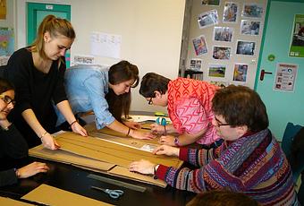 L’élaboration de la maquette en carton a permis aux travailleurs handicapés d’apprendre de nouvelles choses qui paraissent banales, mais qui représentent un vrai défi pour eux (compter, tracer des traits, découper, assembler). Cette semaine, nous avons pu terminer la maquette : il a fallu deux séances pour pouvoir concevoir la maquette en carton. Nous avions au préalable imprimé les plans à partir du modèle conçu sur un logiciel de conception graphique (CATIA)