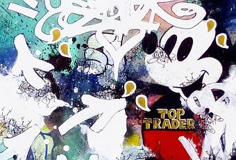 Dernier 'Mickey Top Trader' revu et corrigé à partir d'une toile laissée abandonnée depuis 2012. La série 'Mickey Top Trader' existe depuis bien trois ou quatre ans alors voici le tout dernier avec Orsay Cts (1991). Format 40x40 cm. Technique mixte incluant aérosols, pochoirs, acryliques, poscas et marqueurs. Signé dans la composition et JP Malot au dos.