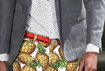 Les détails font les points forts de ce défilé allant des hommes aux cheveux lissés plaqués en arrière, en passant par des chapeaux ornés d’ananas et en finissant par des petites surprises comme des porte-clés suspendus à la ceinture !