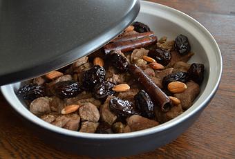 Le tajine est un des plats sucrées-salées que j’adore, évacuateur des parfums du Maghreb. Il se décline avec du poulet, de l’agneau, du poisson, des pruneaux, des abricots, et les parsemer de pignons de pin, de pistache, ou encore d’amandes. C’est un plat complet qui se mange très bien sans accompagnement.