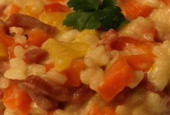 Tiens tiens tiens ! Une recette de risotto, ça faisait un bail non? Trop longtemps pour moi en tout cas :p. Alors ce soir, un petit risotto crémeux aux bacon fumés et petits légumes (carottes et poivrons). De la crème et du parmesan pour onctuosité. Un délice simple et rapide !