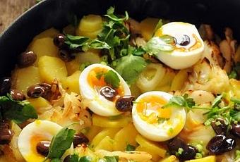 Et puis l'autre jour je passe chez des amis… Quand j'arrive chez certains de mes amis, ils savent que je vais rapidement lancer quelques bises, vaguement demander des nouvelles avant de m'éclipser très vite du côté de la bibliothèque de cuisine voir si des fois un petit nouveau ne serait pas arrivé. Je connais presque par cœur toutes les étagères des livres de bouffe de mes amis, et donc je repère encore plus vite que l'autre cowboy aux jambes arquées dégaine sont colt, les nouveaux livres de cuisine. Et donc je reviens souvent très vite, un peu dépité de ne rien trouver de nouveau, et la soirée peut alors reprendre son cours.Mais là en arrivant dans la cuisine et en regardant l'étagère des livres, j'ai très vite repéré un tout nouveau, tout beau, flambant neuf. Forcément je n'ai pas pu m'empêcher de le prendre en main et de ramener ma proie vers la salle à manger où se trouvait tout le monde à papoter. Et là alors que nous étions presque en fusion, j'entends l'amie chez qui nous étions me dire ah tu l'as trouvé, je viens juste de l'acheter !J'avais le choix soit j'étais un bon ami et je la félicitais pour son achat, j'allais ensuite le reposer puis m'enfermer dans les toilettes pour hurler ma douleur, il me faudrait attendre une prochaine visite pour repartir avec celui qui était déjà mon nouvel ami… Soit…Je me suis donc retourné vers elle, la tête légèrement penchée, l'œil légèrement humide, j'ai balbutié en lui caressant doucement la couverture, qu'est-ce qu'il est beau… Et puis j'ai commencé à papillonner de l'œil en hochant tristement la tête. Elle m'a regardé, a souri avec cet air de dire comme si je ne te connaissais pas et puis elle a lancé la phrase magique, je te le prête ??? Je n'ai pas eu le courage de faire semblant de refuser. Des fois vraiment entre le chacal des cuisines et moi, y'a pas gros de différence…Et c'est comme ça que je suis rentré content comme un enfant découvrant les fraises, avec son livre As minhas receitas de bacalhau 500 receitas de Victor Sobral aux éditions Casa das letras (attention il est bien sûr en portugais), une merveille de livre qui prouve avec talent qu'il y a plus d'une recette de morue par jour au Portugal !Morue, pomme de terre et œufs coulants !Ingrédients : 1kg de petites pommes de terre à chair ferme – 1kg2 de filet de morue – 4 oignons – 2 gousses d'ail – 6 œufs - 3càs de petites olives noires dénoyautées – 1 litre de lait – ½ càc de pimenton (paprika fumé) - du persil plat – de l'huile d'olive – sel et poivre