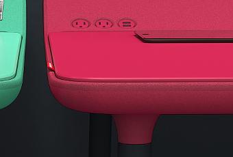 Une surface soft et coloré, le tout connecté, le bureau vous propose un large plateau de travail, sous lequel viennent se glisser différents blocs de rangement, la partie relevée permet également de fixer des punaises ou petits éléments d’accroche d’accessoires.