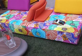 Et si je suis poète c'est peut être essentiellement grâce à la présentation phare de la collection, la banquette "Escapade Outdoor". Habillée par Missoni (y en a qui ont de la chance), c'est une invitation irrésistible au farniente et à la bonne humeur. La prouesse technique de l'histoire, ce sont ces coussins/dossiers sur supports anti dérapants qui permettent de s'assoier dans tous les sens souhaités, mais confortablement toujours!!