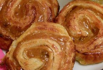 Pour ces petits escargots, j'ai d'abord réalisé la pâte à Danish de Christophe Felder, que j'ai garnie avec de la crème pâtissière aromatisée au praliné, et avec des pistaches concassées. Puis, j'ai recouvert le tout, après cuisson, d'un sirop à l'eau de fleur d'oranger.